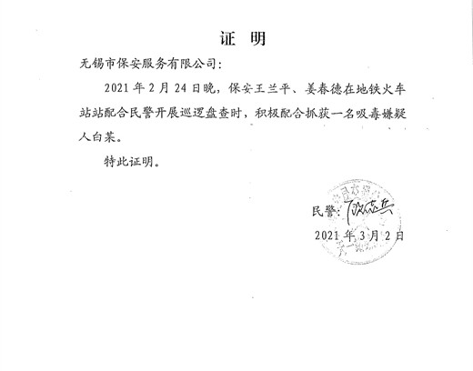 2月24日,公司保安隊員王蘭平、姜春德在巡邏盤查時協(xié)助地鐵天一站民警抓獲一名吸毒嫌疑人員,兩人在行動中反應(yīng)迅速、處置合理,得到了公安機(jī)關(guān)的充分肯定。