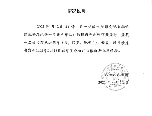 4月12日,公司派駐天一派出所保安隊員滕大華協(xié)助民警在地鐵一號線火車站北通道開展巡邏盤查時,查獲一名臨控對象并移交公安機(jī)關(guān)作進(jìn)一步處理。公司保安隊員多次協(xié)助民警查獲臨控人員,為維護(hù)地鐵安保作出了積極貢獻(xiàn),受到了公安機(jī)關(guān)的高度肯定與贊揚(yáng)。